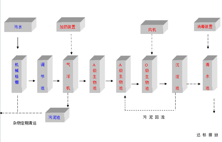 針對該項目具體污水水質(zhì)的特點,本方案擬采用常規(guī)的“氣浮機(jī)(加藥)+A/O/O生物接觸氧化+消毒設(shè)備”工藝,該處理工藝較為成熟,操作運行方便,日常費用低廉,出水穩(wěn)定,主要設(shè)備為鋼結(jié)構(gòu),考慮到周邊環(huán)境和衛(wèi)生問題,故該污水處理工程決定采用全埋地式結(jié)構(gòu),上部覆土,種植花木、草坪,進(jìn)一步美化環(huán)境。